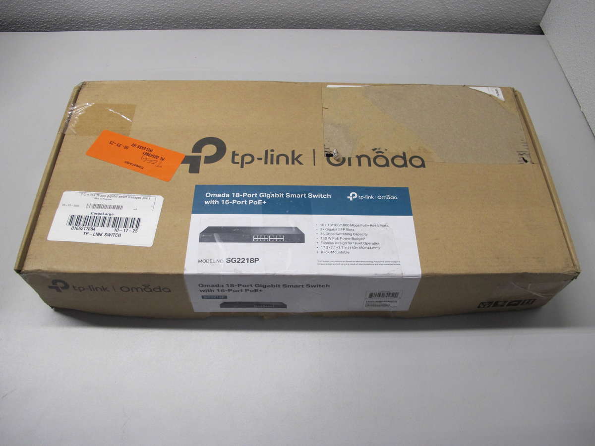 TP-Link Omada 18-Port Gigabit Smart Switch with 16-Port PoE+ and 2 SFP Slots.